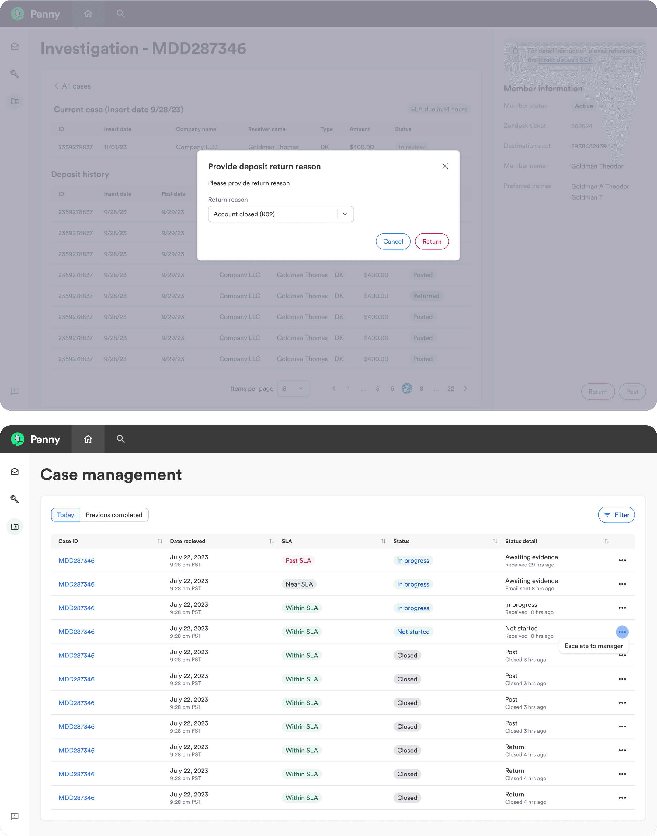 We started with the Direct Deposit team for MVP as a simple but critical use case. They were responsible for reviewing first-time deposits, verifying member identity, and flagging suspicious activity—yet they were managing this high-risk work through spreadsheets, Slack messages, and PowerBI dashboards.