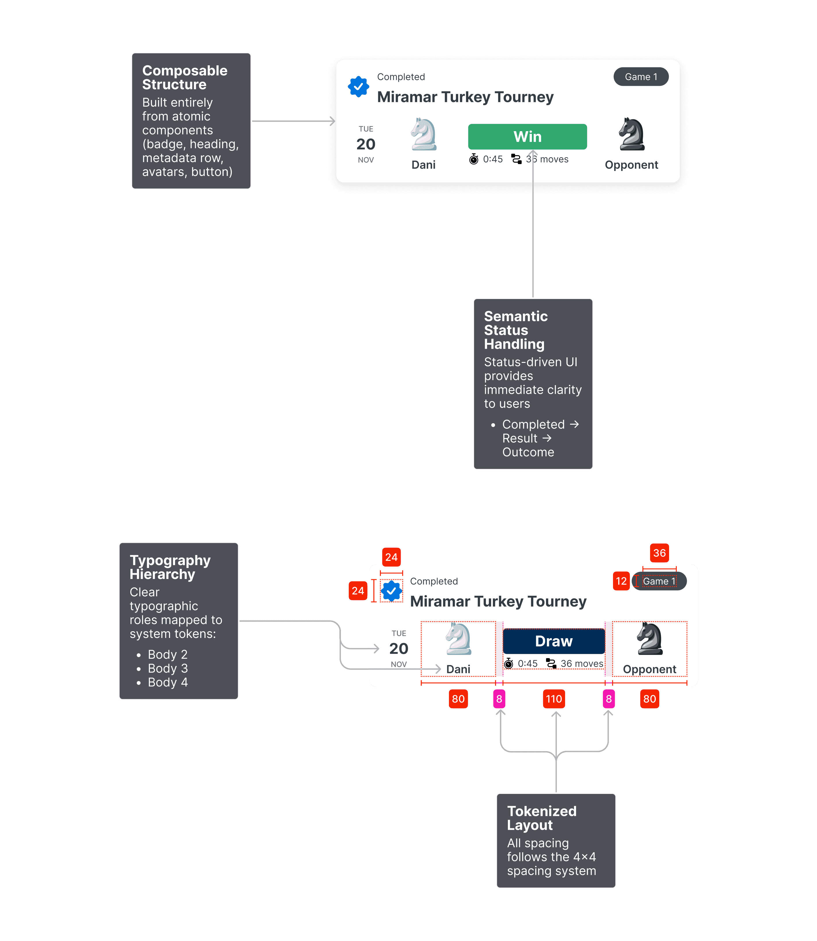 Clearer communication of game outcomes through semantic states and structured metadata, making results easier to scan for both organizers and fans while supporting future variants and states.